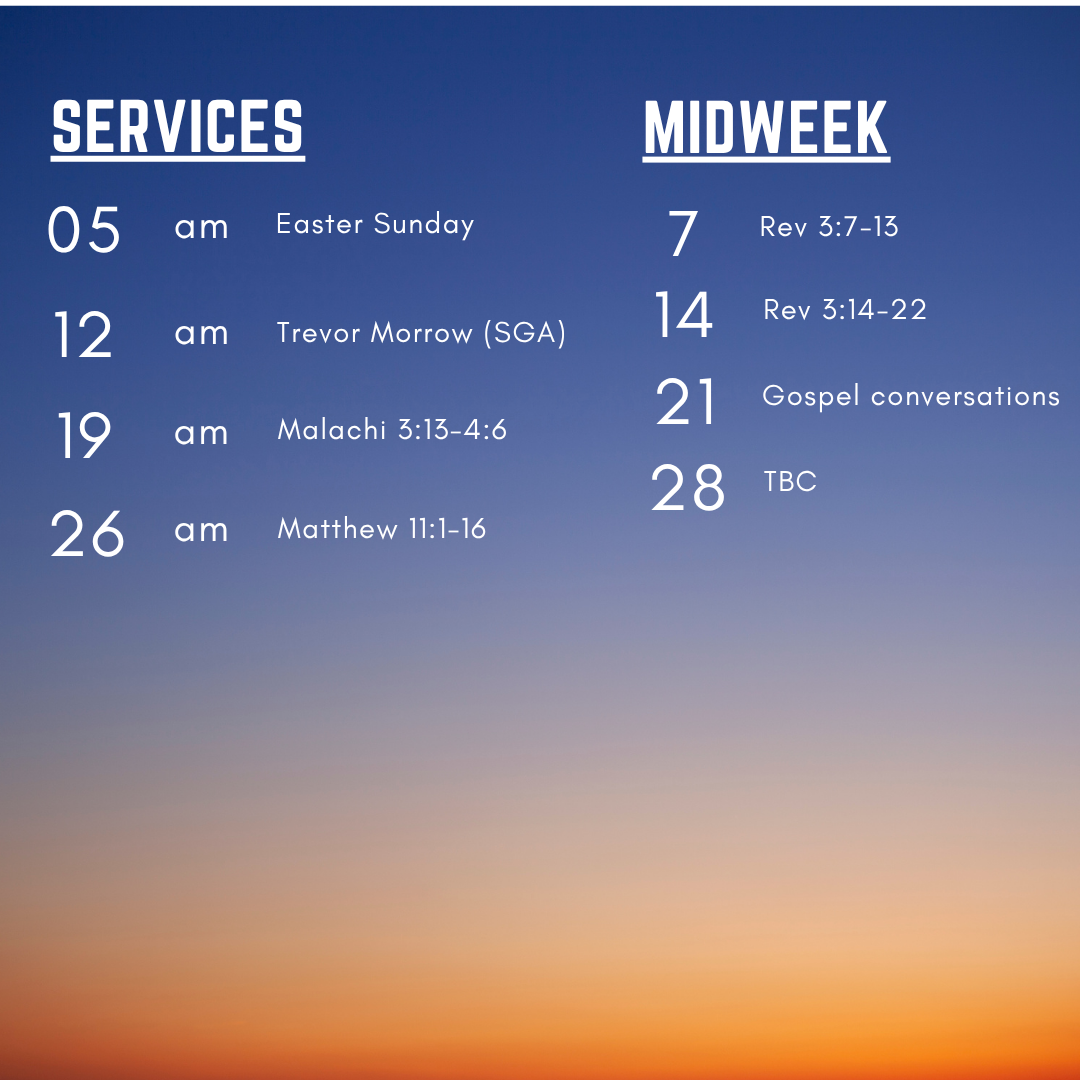 Tuesday from 7:30pm-8:30pm for prayer and bible study